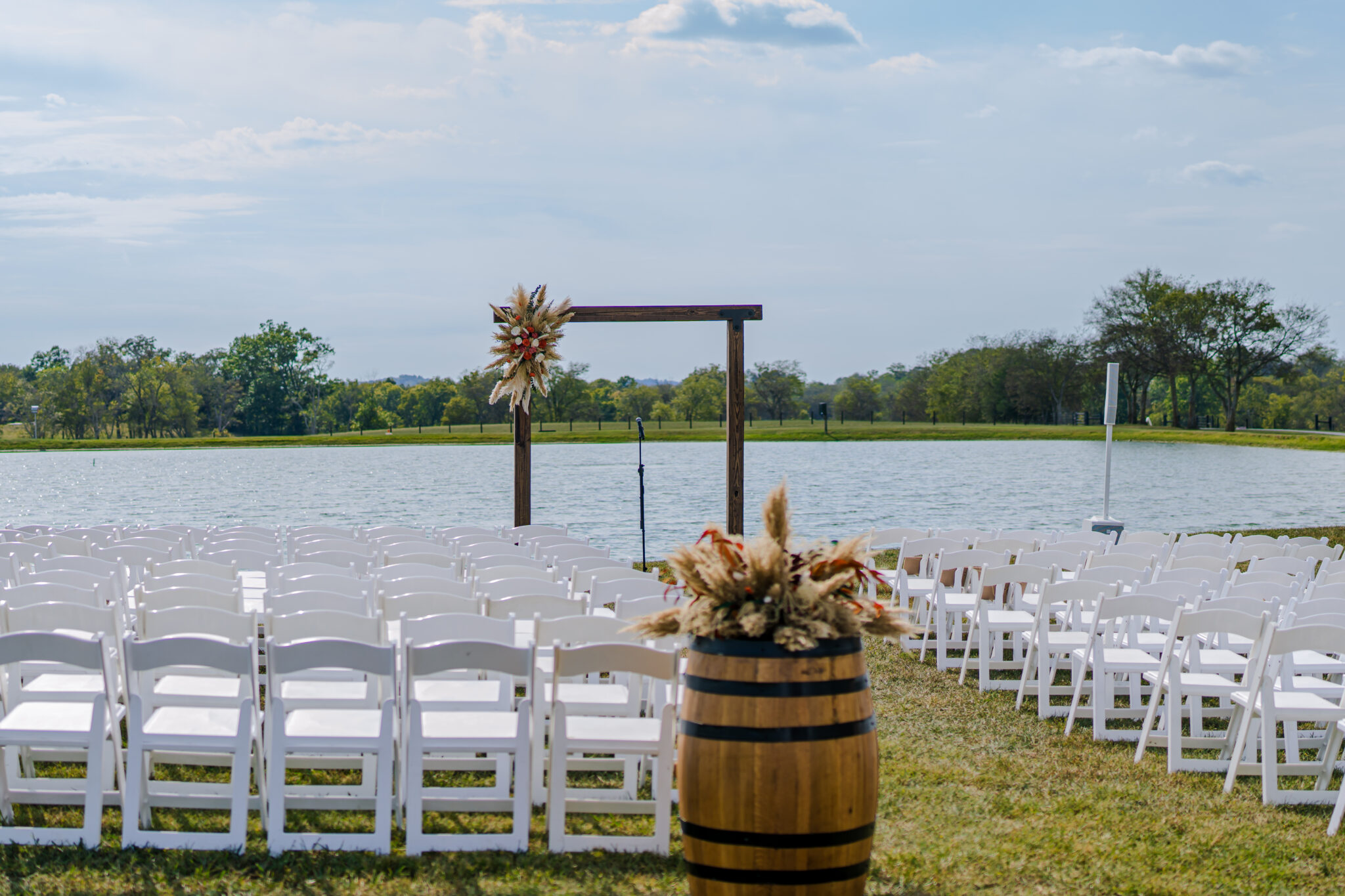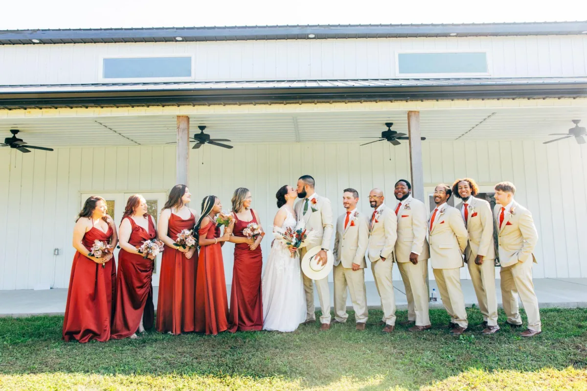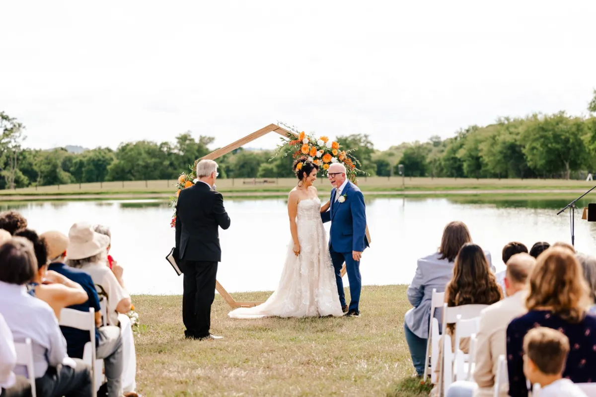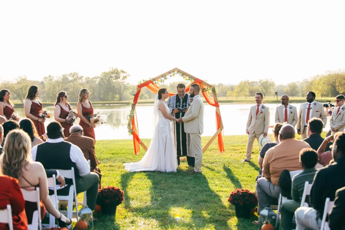 Riverbend Ranch & Retreat offers a breathtaking countryside setting surrounded by rolling hills, peaceful ponds, and scenic river views. Couples can exchange vows in a beautiful outdoor ceremony space and celebrate in our elegant White Barn reception venue. The natural landscape creates the perfect romantic backdrop for unforgettable wedding photos and moments.