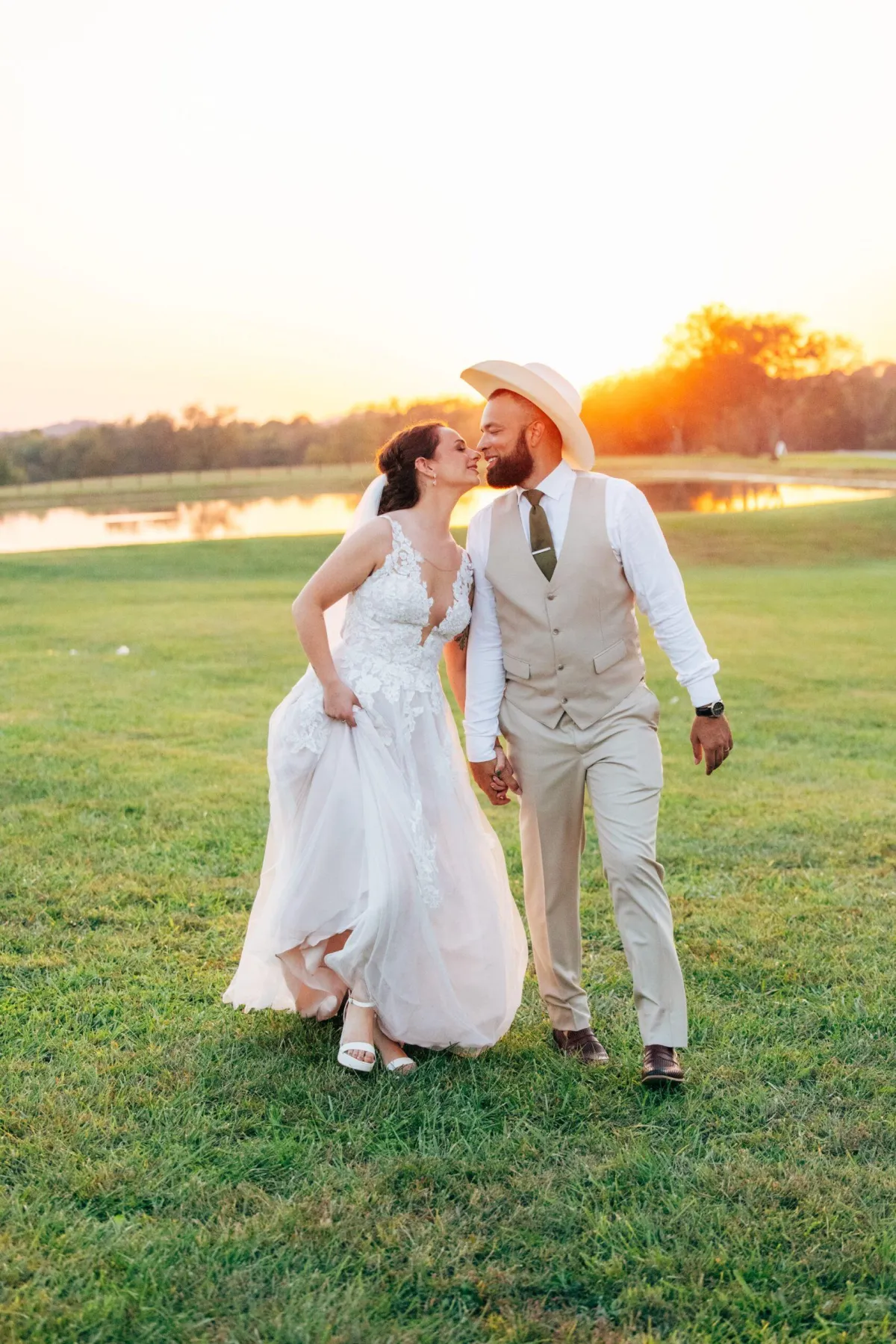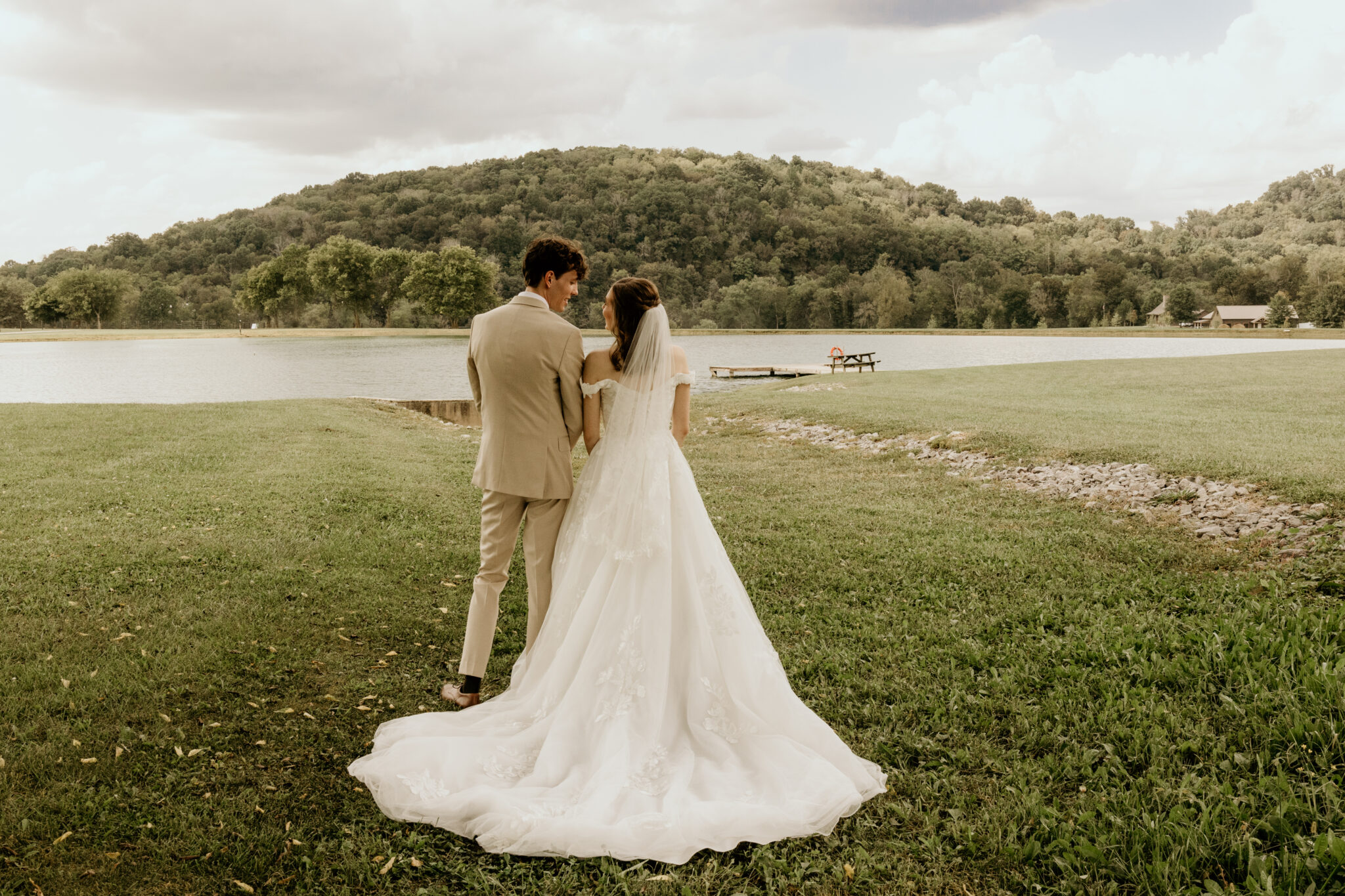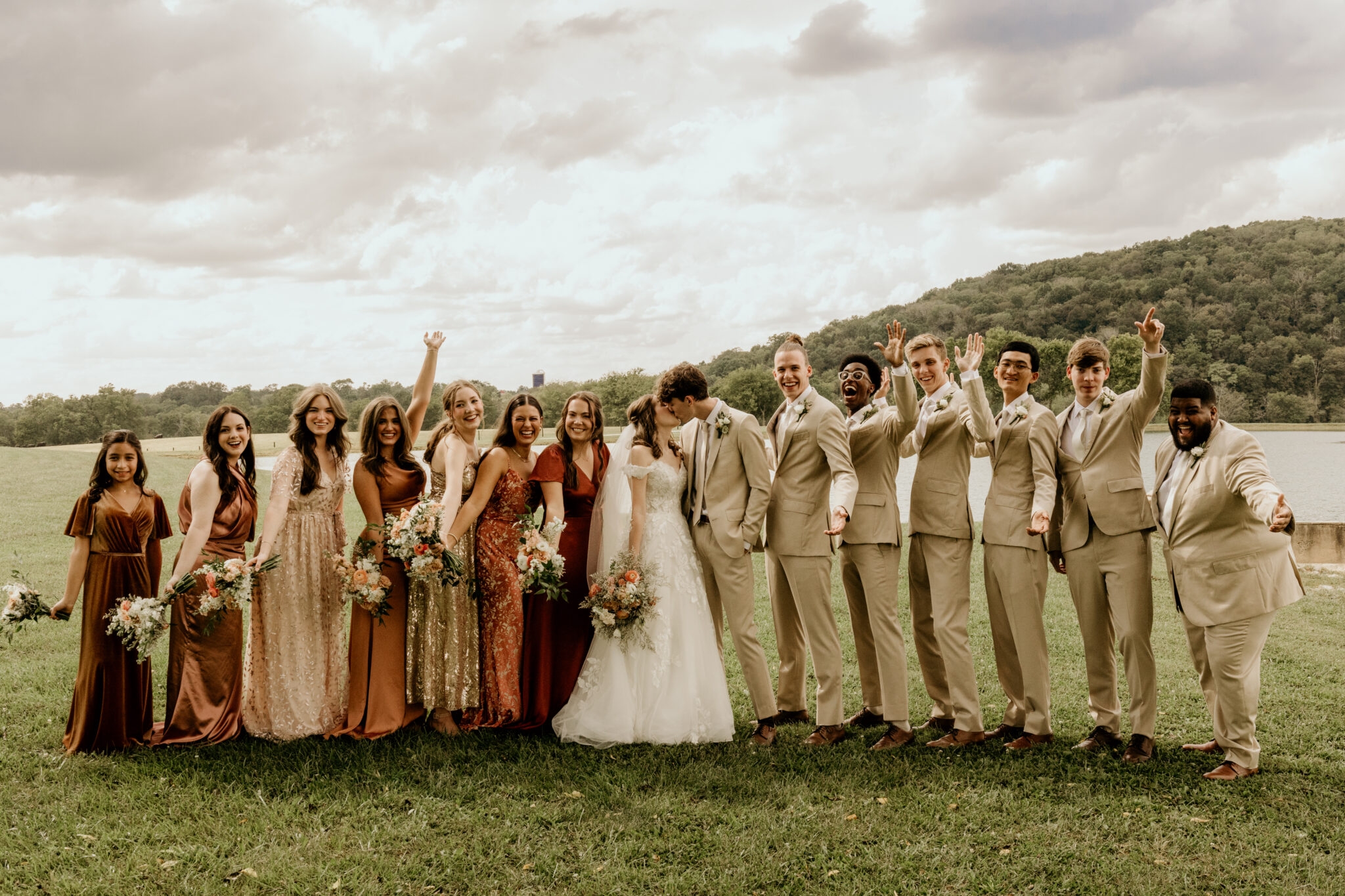 Riverbend Ranch & Retreat offers a breathtaking countryside setting surrounded by rolling hills, peaceful ponds, and scenic river views. Couples can exchange vows in a beautiful outdoor ceremony space and celebrate in our elegant White Barn reception venue. The natural landscape creates the perfect romantic backdrop for unforgettable wedding photos and moments.
